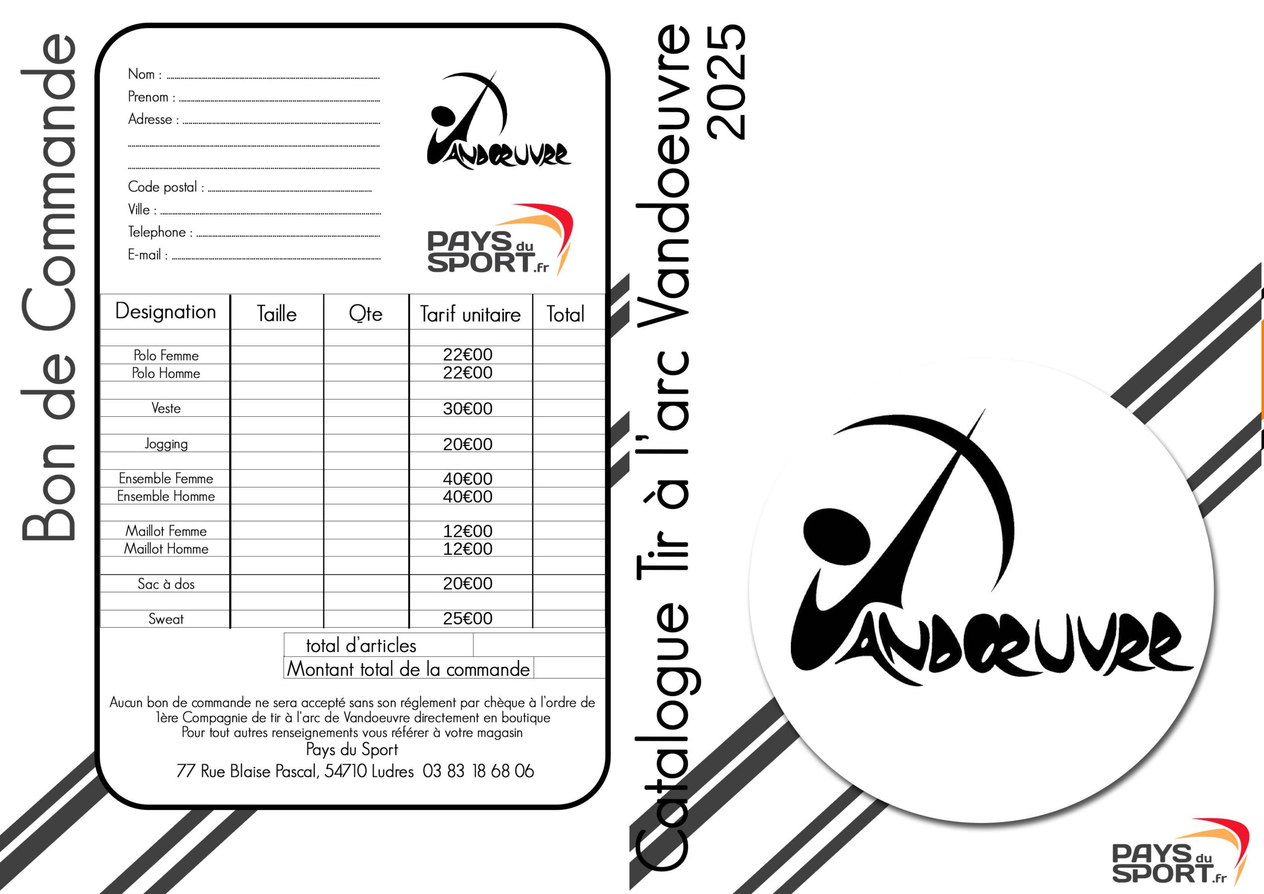 Pour toute commande de tenues, remplir le bon de commande, libeller votre chèque à « 1ère Compagnie de Tir à l’Arc de Vandoeuvre » et donner le bon de commande et le chèque à un responsable du club le mardi ou le vendredi lors des séances de tir, entre 18h et 19h30.